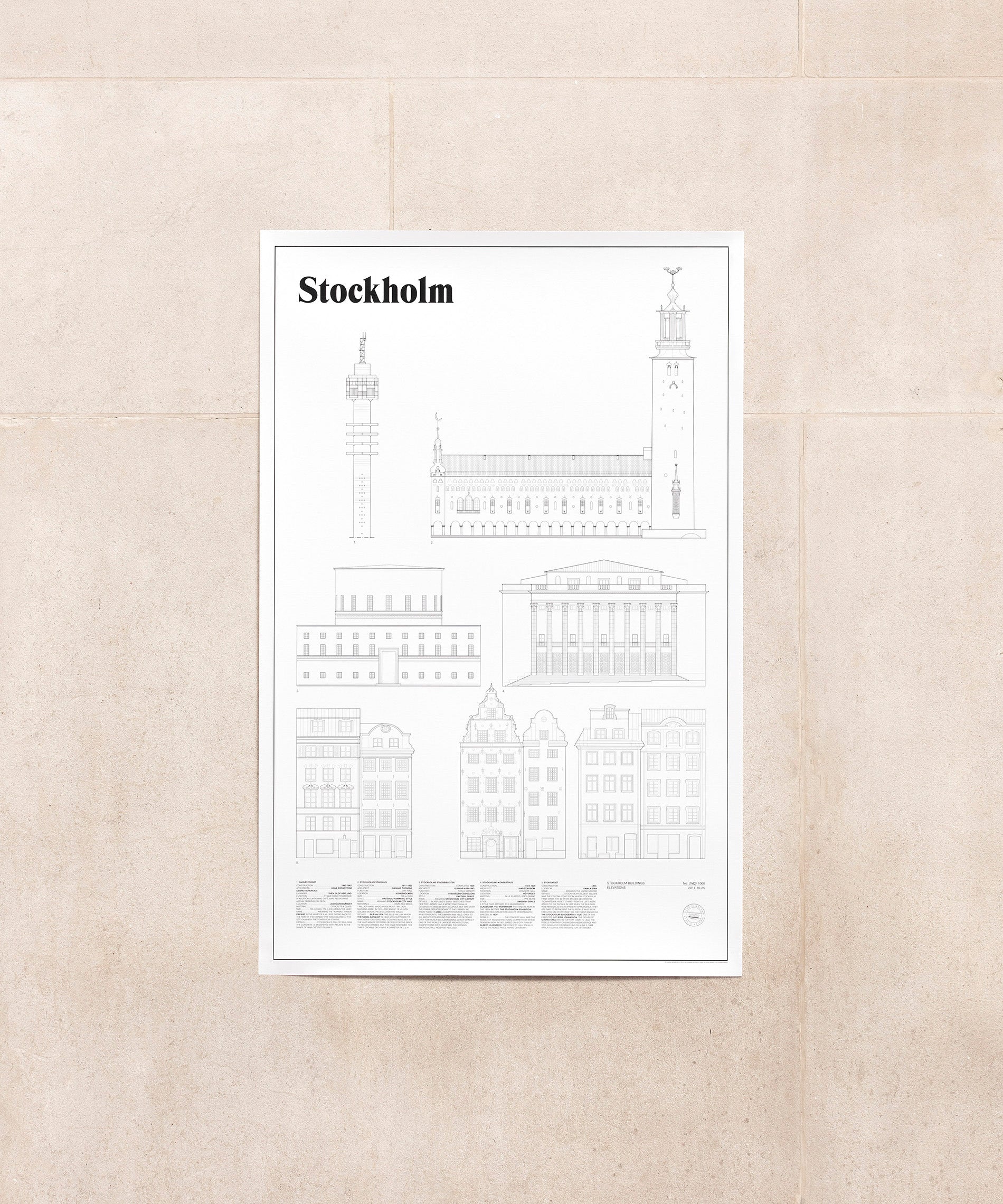 Elevation drawings of 5 Stockholm buildings: Kaknästornet, Stockholm City Hall, City Library, Concert Hall and Stortorget.